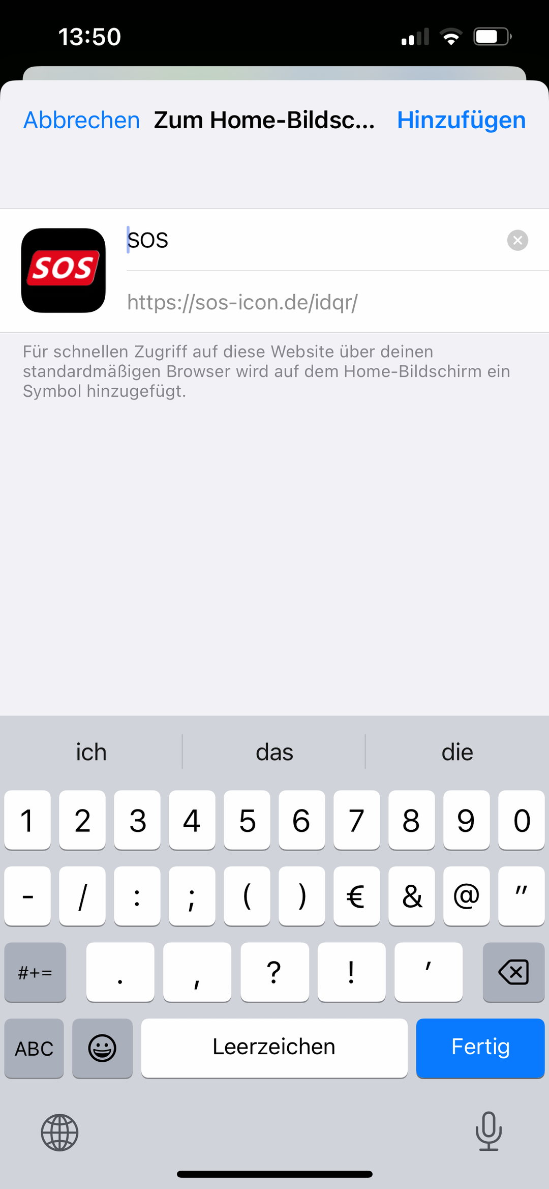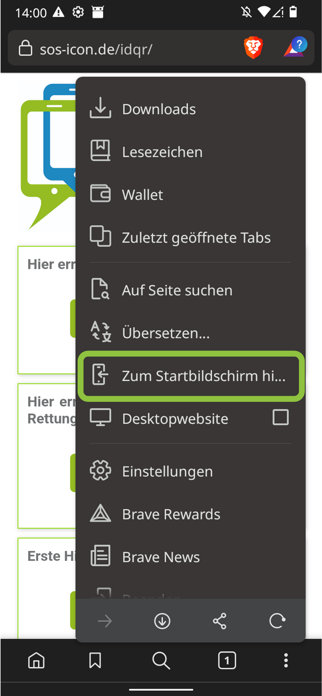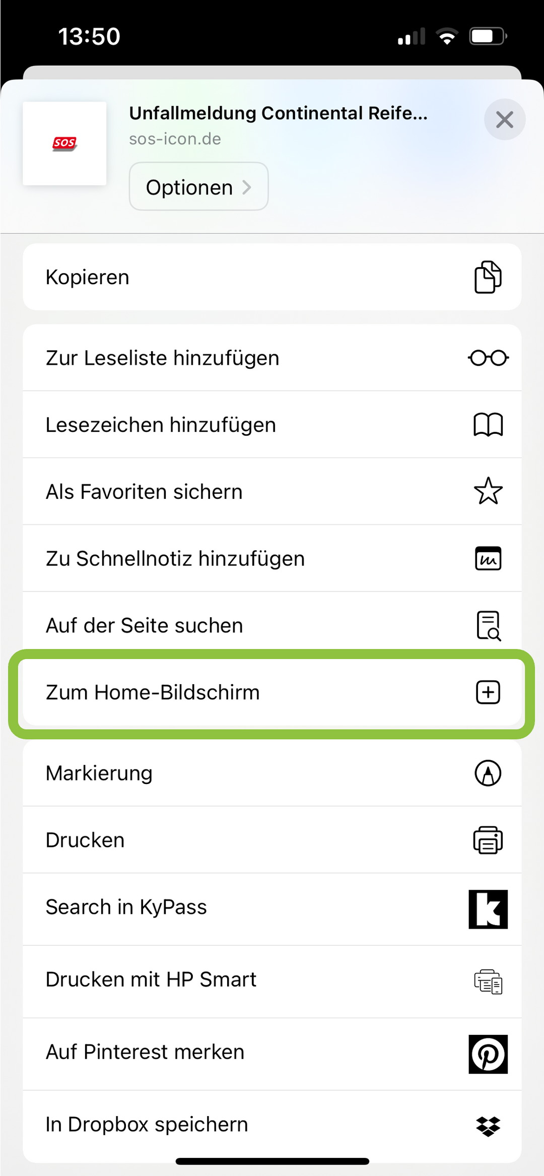 1. tap the arrow in the centre of the menu bar when viewing www.sos-icon.de. Scroll down the options list and click on "Add to home screen".